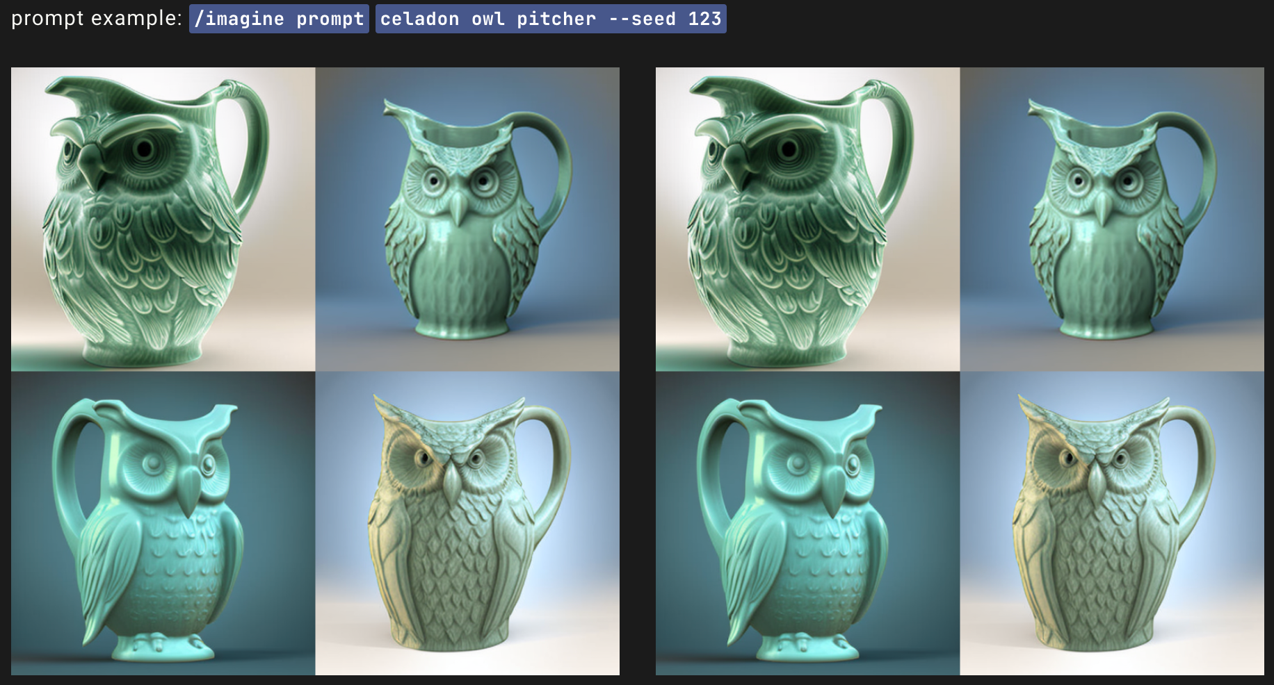 你在使用 Midjourney 的时候,应该会发现,即使用相同的 prompt,每次生成的图片都会不一样。其实 Midjourney 会为每个生成的图片打上一个 seed 编号,你可以在 prompt 里加入这个 seed 参数,这样每次生成的图片就一样了,以下是官方的例子: