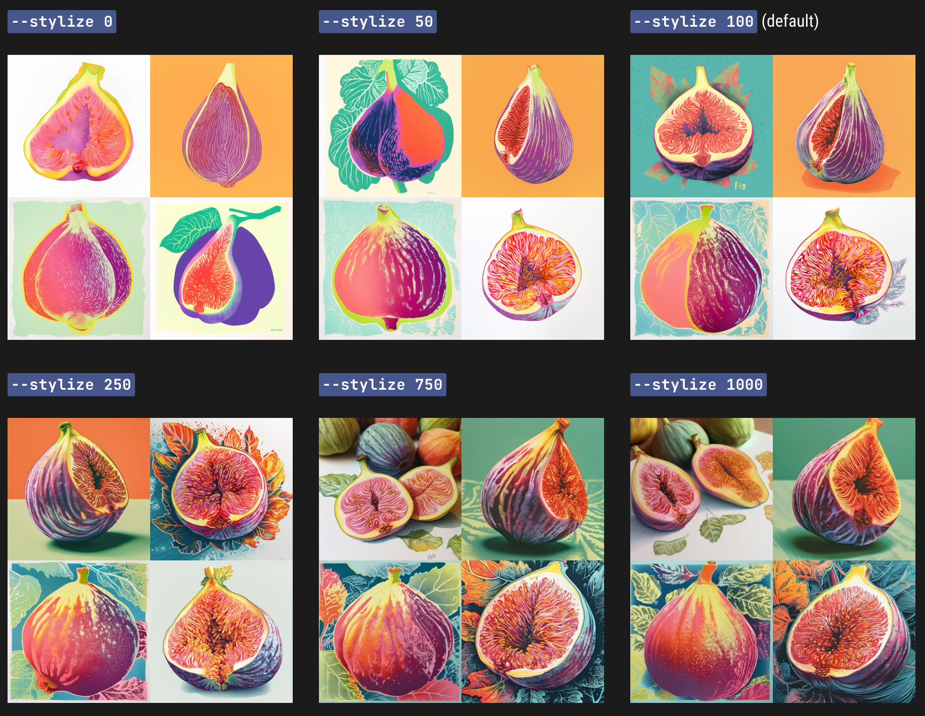 低程式化值生成的图像与提示非常匹配,但艺术性较差。高程式化值创建的图像非常具有艺术性,但与提示的联系较少