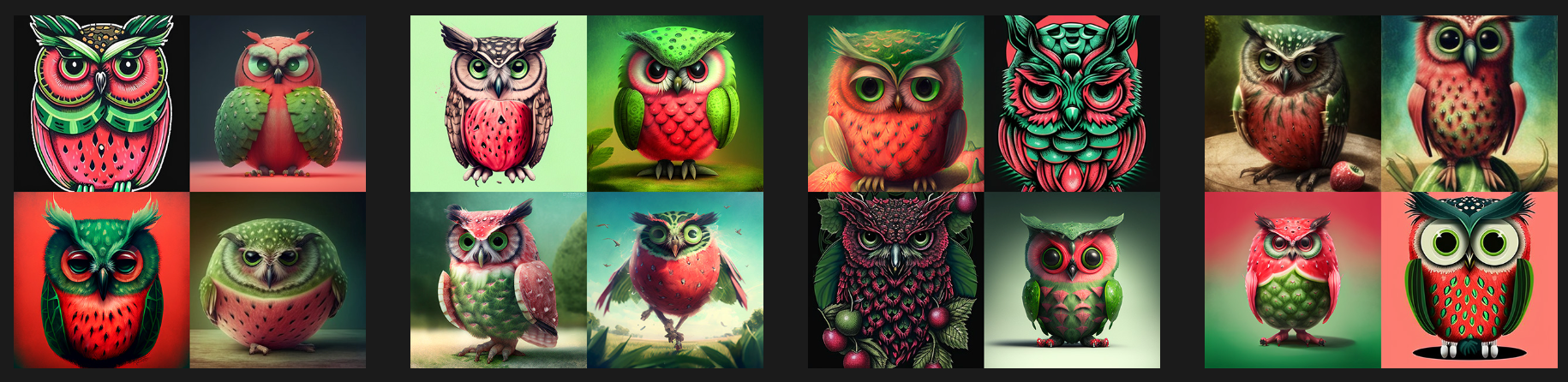 这是当 Chaos 为 0 的时候,一致性会比较高,西瓜和猫头鹰的融合的方式,在四次输出里都比较类似,另外在单次输出里,4张图(四宫格)的风格相似度也比较高: