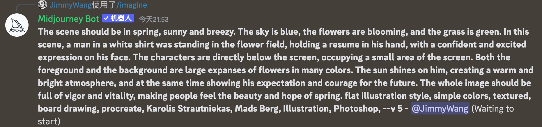 接着你就会看到一个叫 Midjourney 的机器人复述了你的话,在这句话的最后,有一句 Waiting to start,这就意味着你的 prompt ,机器人已经接收到了,正在为你生成图片:
