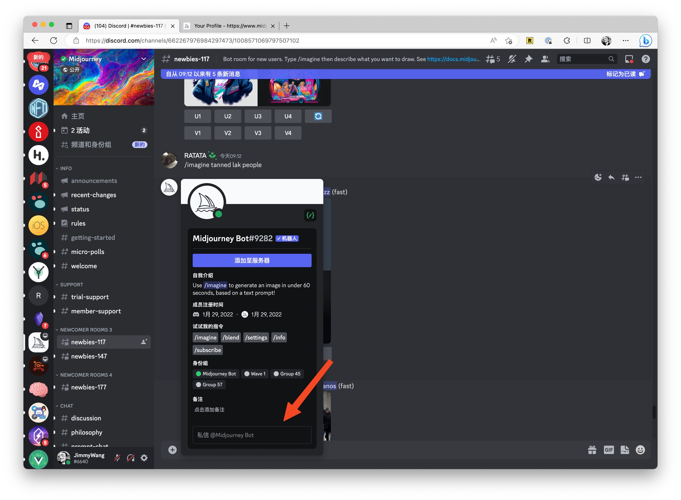 使用 Midjourney Bot 也很简单,跟在 Discord 的单聊比较类似,你只需要在 Midjourney 的 newbies-XXX 频道里找到 Midjourney Bot,然后点击它的头像,在弹出的菜单的下方有个「私信 @Midjourney Bot」的输入框,在这个输入框里,随便输入点内容,然后按回车发送。