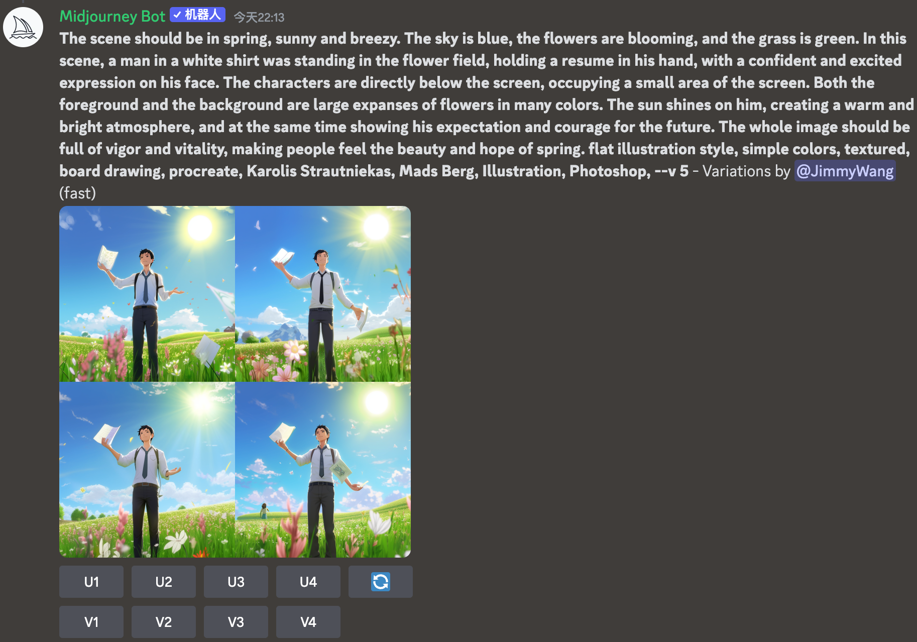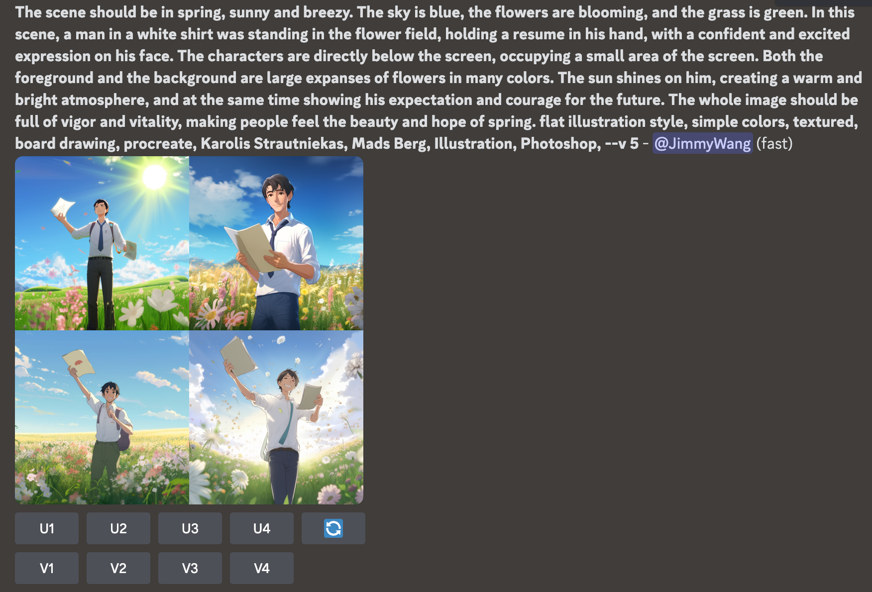 生成的四格图,单格图片的分辨率是 512 512(如果你是 V5 版本,则是 1024 1024),如果你想要生成一个更清晰的图片,则可以点击四宫格图片下的 U 按钮,U1 代表左上角第一张图,U2 是右上角,U3 是左下角,U4 是右下角。点击后,你需要等待一会,就会生成高清图。需要注意,V5 版本,U 按钮已经不会影响分辨率了,只是做为一个裁切图片的功能。换句话说就是将第一次生成的四格图,裁成一张。