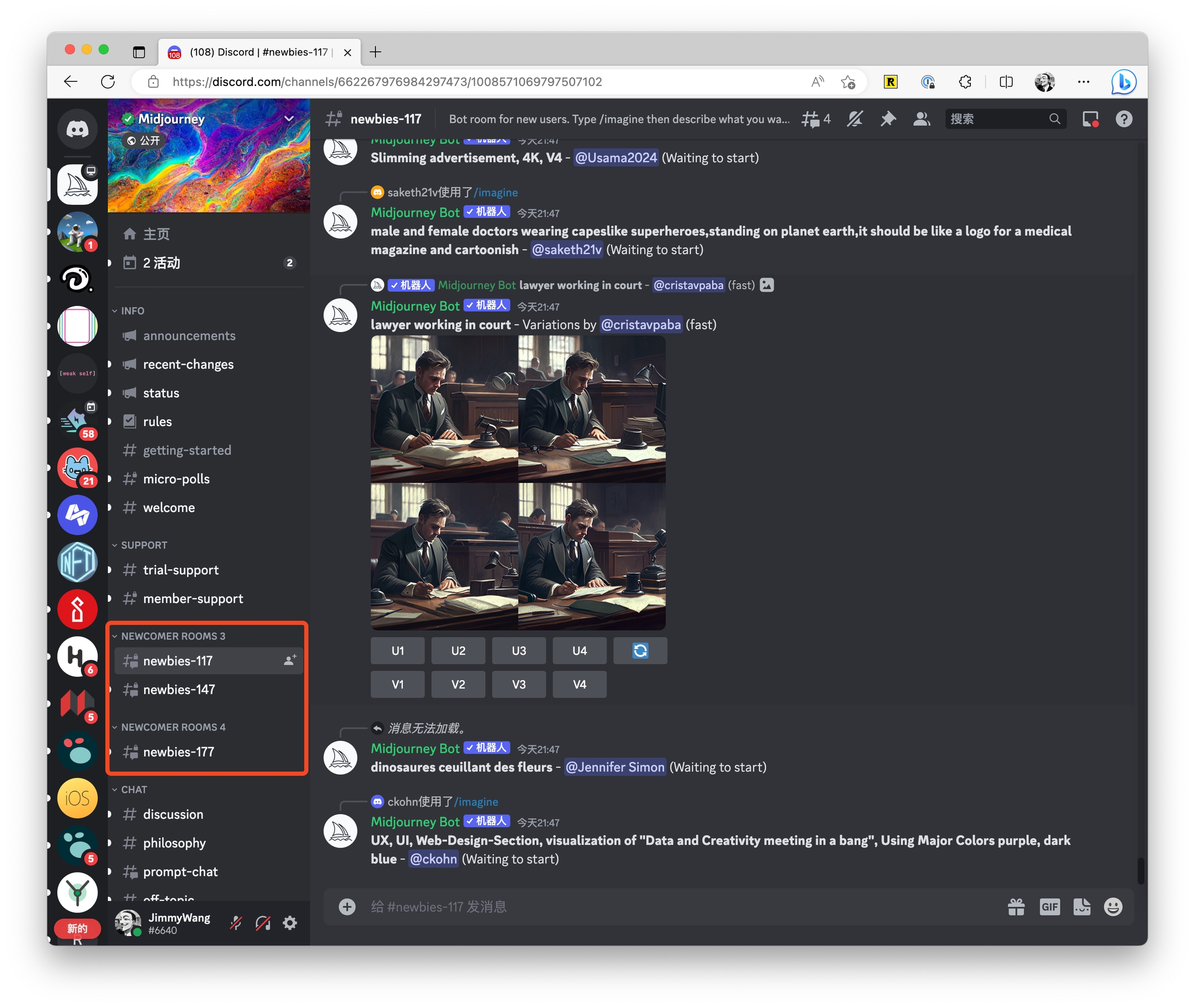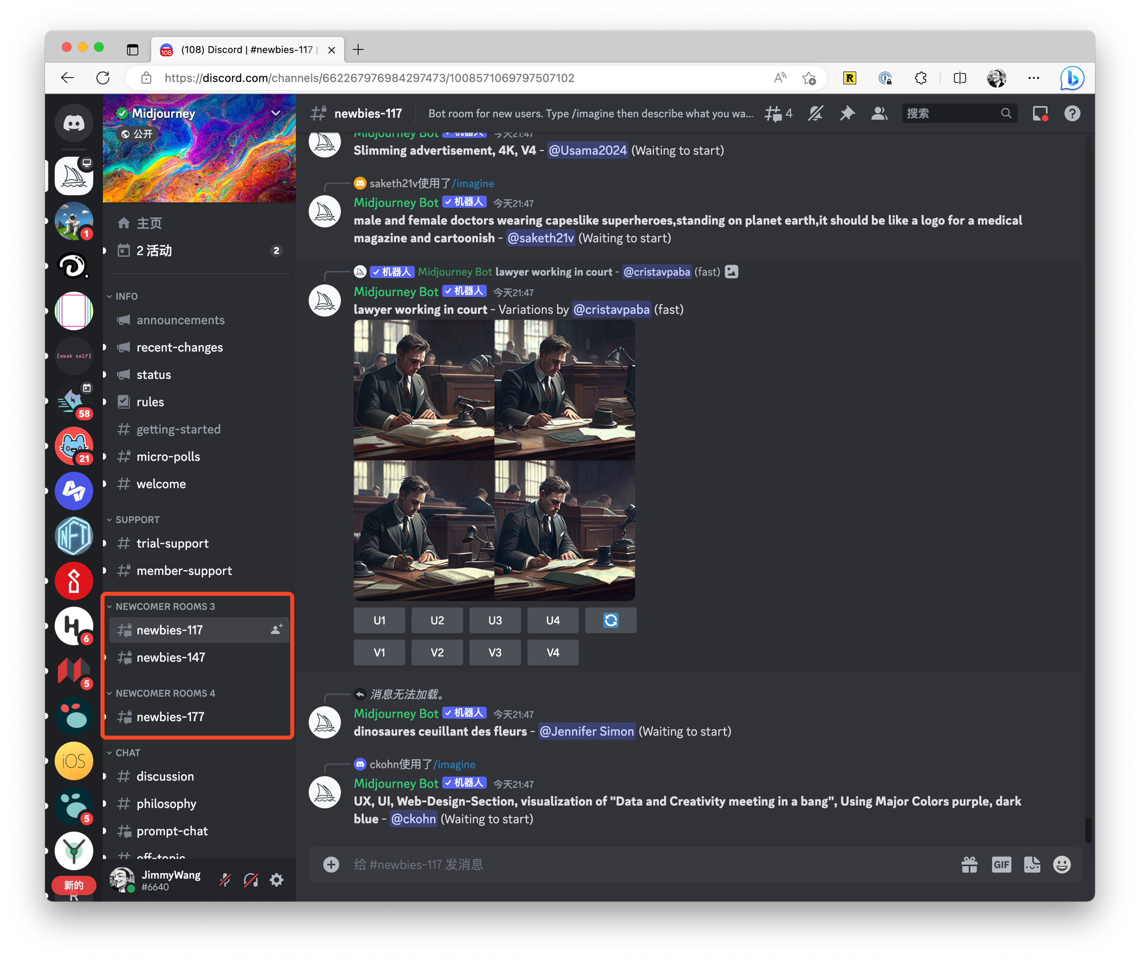 接着你就能在 Midjourney 的 Discord 的左侧栏,看到 newbies-XXX 的频道,随便点击一个,进入该频道,这个频道就是给免费用户测试使用的: