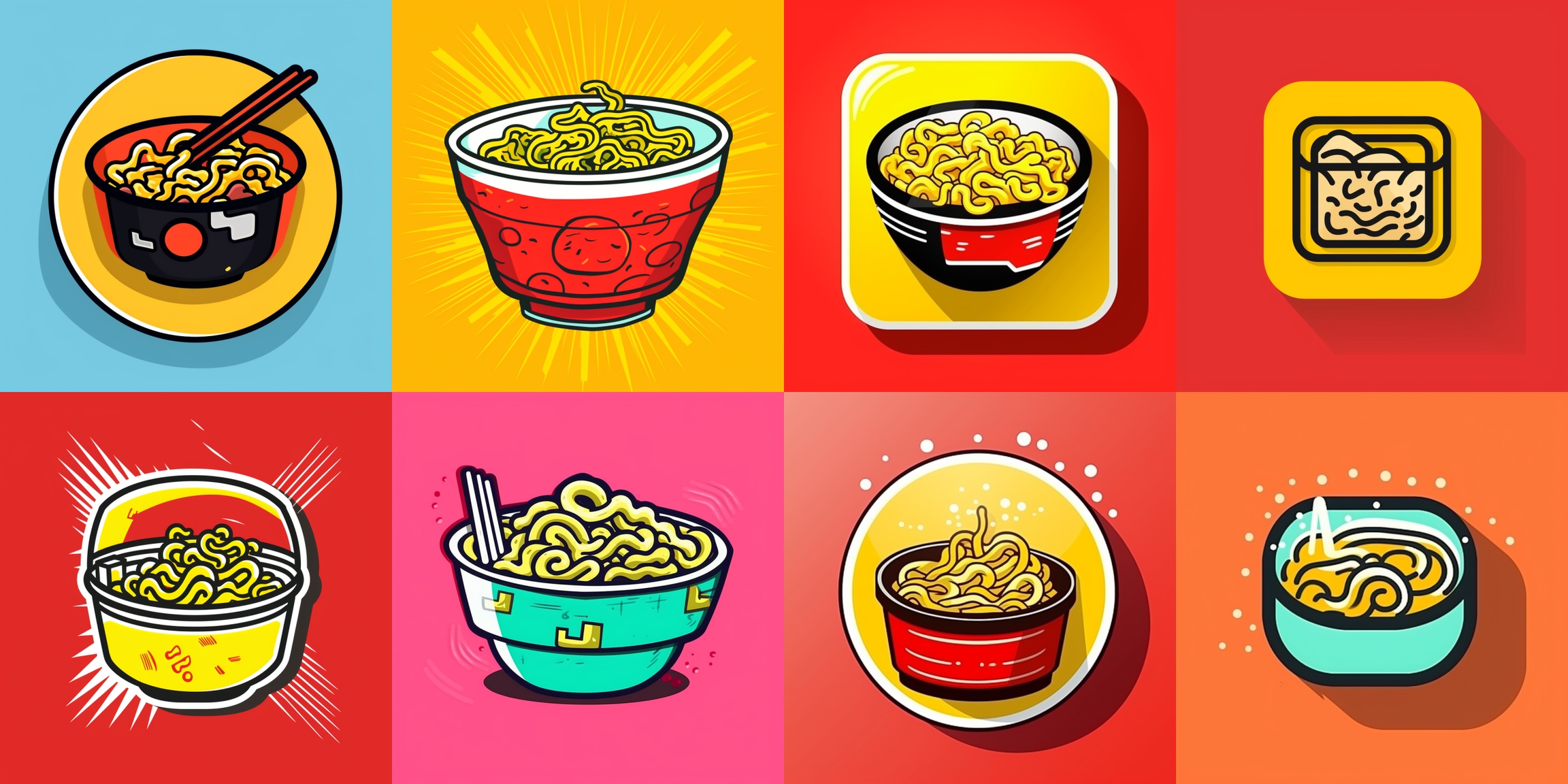squared with round edges mobile app logo, an icon for a Instant Noodles company, pop art另外我发现在 Logo 图形描述前加 an icon for ,生成的 Logo 会更符合预期一些,右边是加了 an icon for ,左边是没有加的: