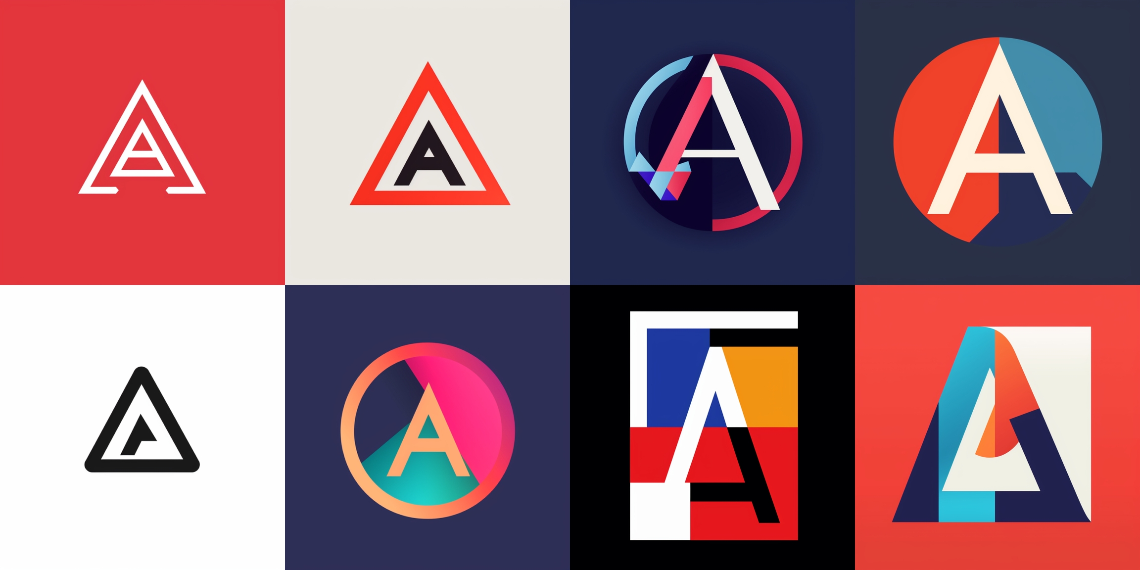 当然也不是说只能加 Logo 设计师,加上没有设计过 Logo 的设计师名字,也很有意思。比如右边四张图我加的就是 Piet Cornelies Mondrian,第三张 logo 有 Composition II in Red, Blue, and Yellow 那味了。左边四张则是 Paul 的,第二张红色框加黑色 A,有他的经典眼镜 logo 那味,非常喜欢: