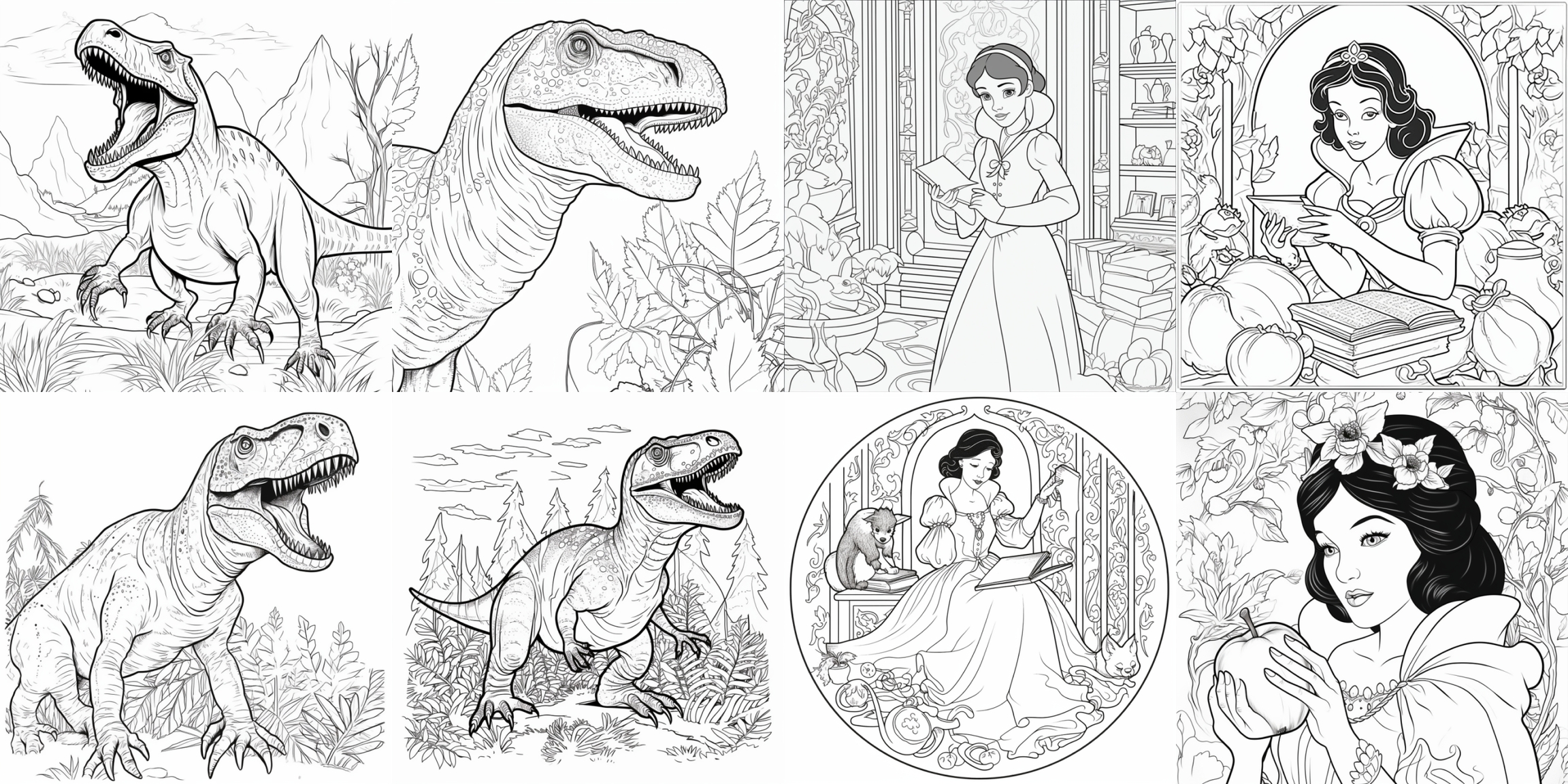 最后一个要介绍的也不知道是不是插画,但可能不少朋友见过,就是那种可以让你在上面用蜡笔,或水笔填色的填色插画。我觉得非常适合让小朋友自己生成填色插画,然后打印出来,让小朋友上色。以下是霸王龙的例子: