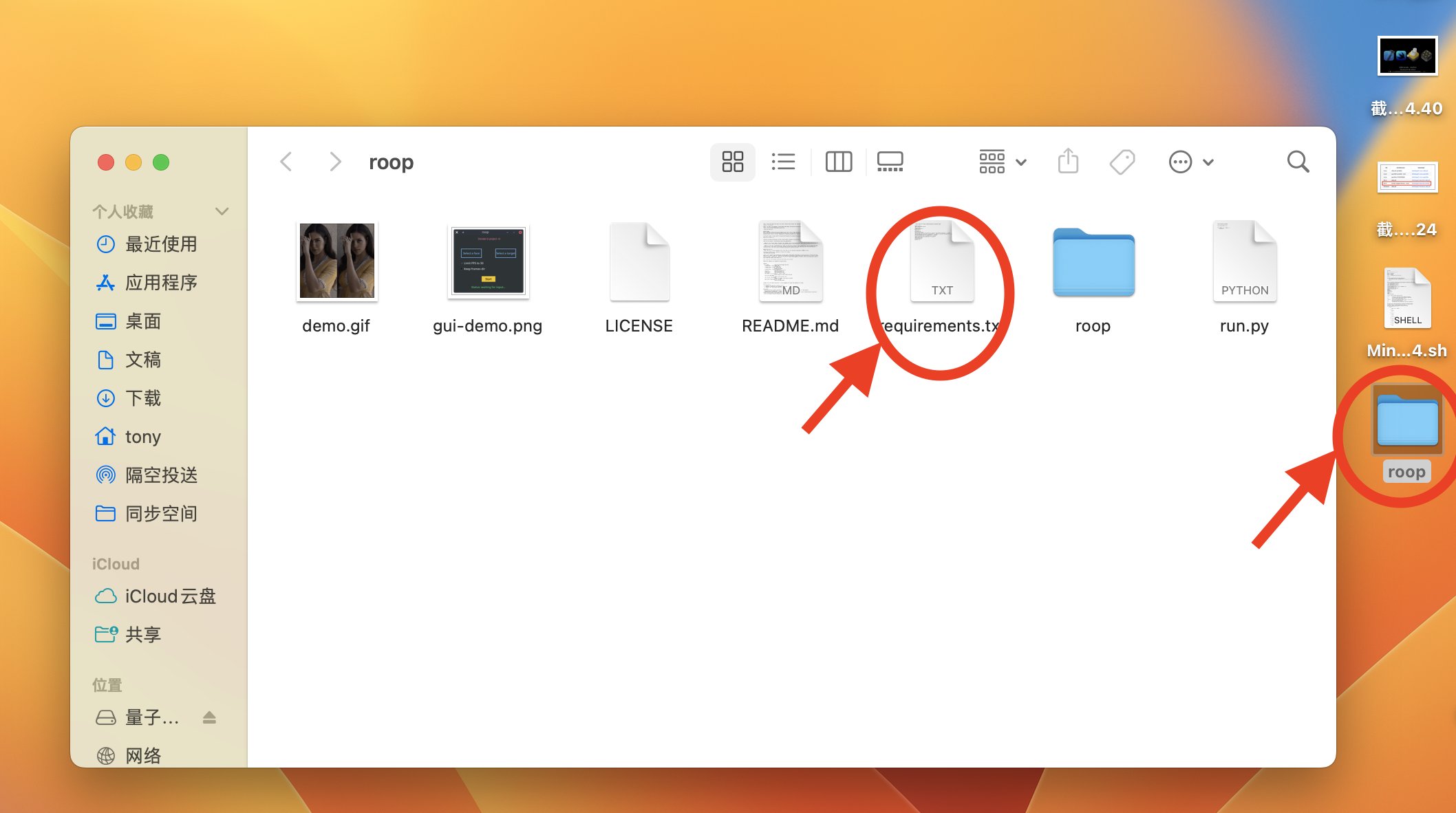 如果按上面的步骤来,你当前所在的位置为Desktop。安装依赖需要进入roop文件夹。