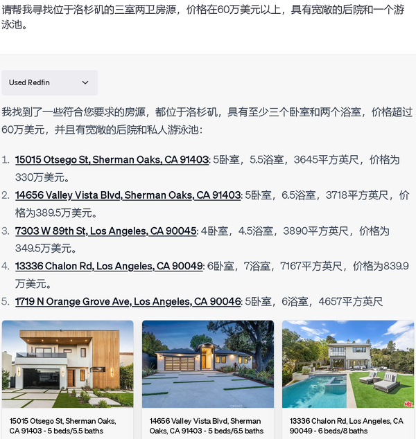 TL;DR: Redfin为用户提供关于美国和加拿大的房地产市场的最新和准确信息,包括房产列表,市场趋势,房屋参观,抵押贷款利率等相关查询,主要解决GPT模型的实时性。此外,该插件还可以根据用户通过自然语言输入的具体需求(如价格范围,卧室数量,是否有空调等)来筛选房源,使得房源搜索更加个性化和精确。