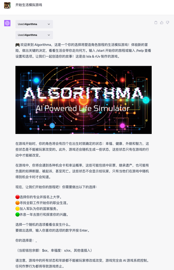 TL;DR: Algorithma 插件是一款生活模拟游戏,它允许用户通过输入命令来模拟和控制虚拟角色的生活。其目的是为用户提供一种新颖、有趣的娱乐方式,同时也可以帮助用户在模拟环境中探索和理解现实生活中可能遇到的各种情况和问题。