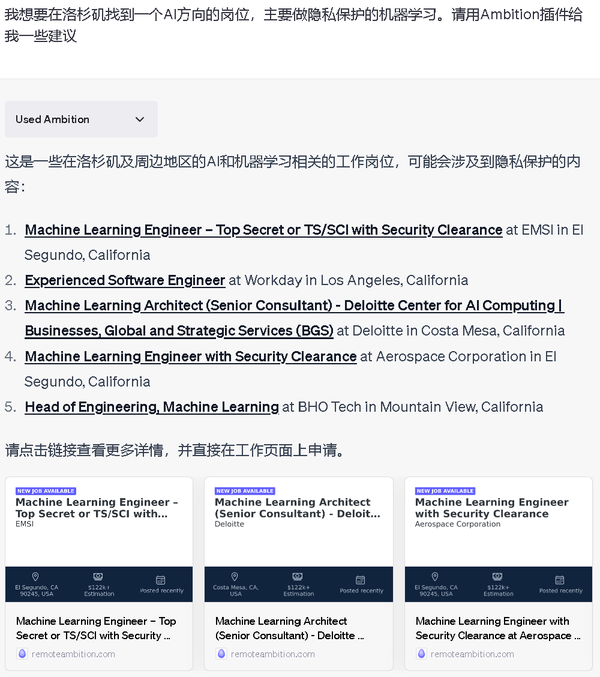 TL;DR: Ambition的主要目标是帮助用户找到他们附近的相关工作,解决GPT模型的实时性,以及在处理特定领域信息,如就业和招聘信息时的痛点。结合GPT,可以了解用户正在寻找什么样的工作,然后进行更匹配的搜索。