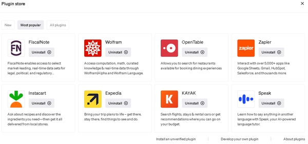 在插件开发流程方面,不同于Chrome,AppStore等平台基于代码的开发范式,开发者在构建好本地API后,仅需使用自然语言描述在什么场景下如何使用对应的API,即可将插件部署到ChatGPT平台。猜测OpenAI的GPT系列模型具有连接不同结构化文本的能力,可能是新的零代码开发范式。在插件的使用过程中,每个会话中最多可以选择三个插件进行联合使用,并由GPT模型自行决定在使用过程中是否调用插件,以及调用哪些插件。