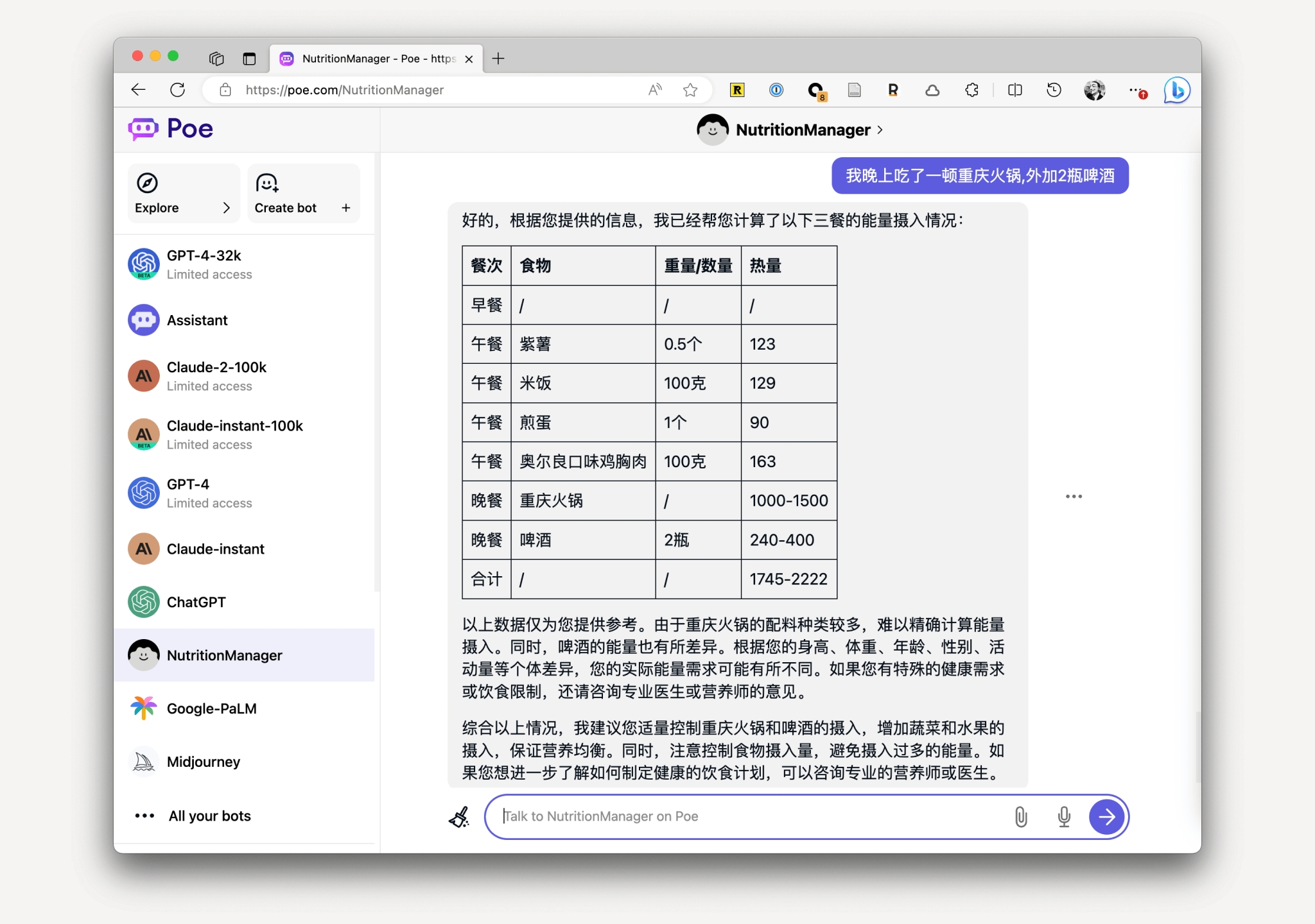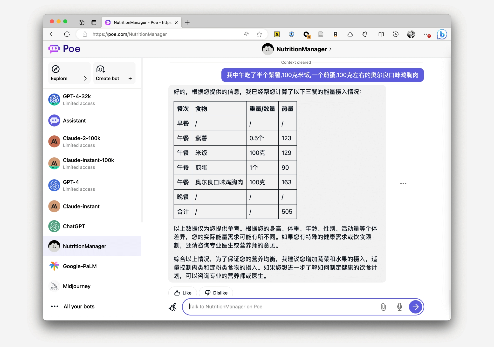 经过我多次测试,主要还是因为剂量的问题,如果你输入的是「半个」、「一碗」等不太精准的量词,AI 的每次结果可能就会不太一样。不过我觉得问题不大,多次的结果差不了特别多。我又不是备赛,单纯日常记录够用了。 如果你对结果还是不太满意,可以试试 GPT-4,经过我的测试,GPT-4 是目前几个模型中准确性最高的。